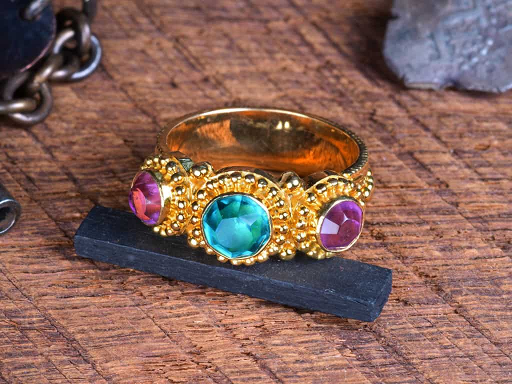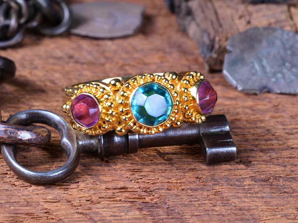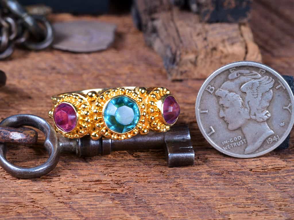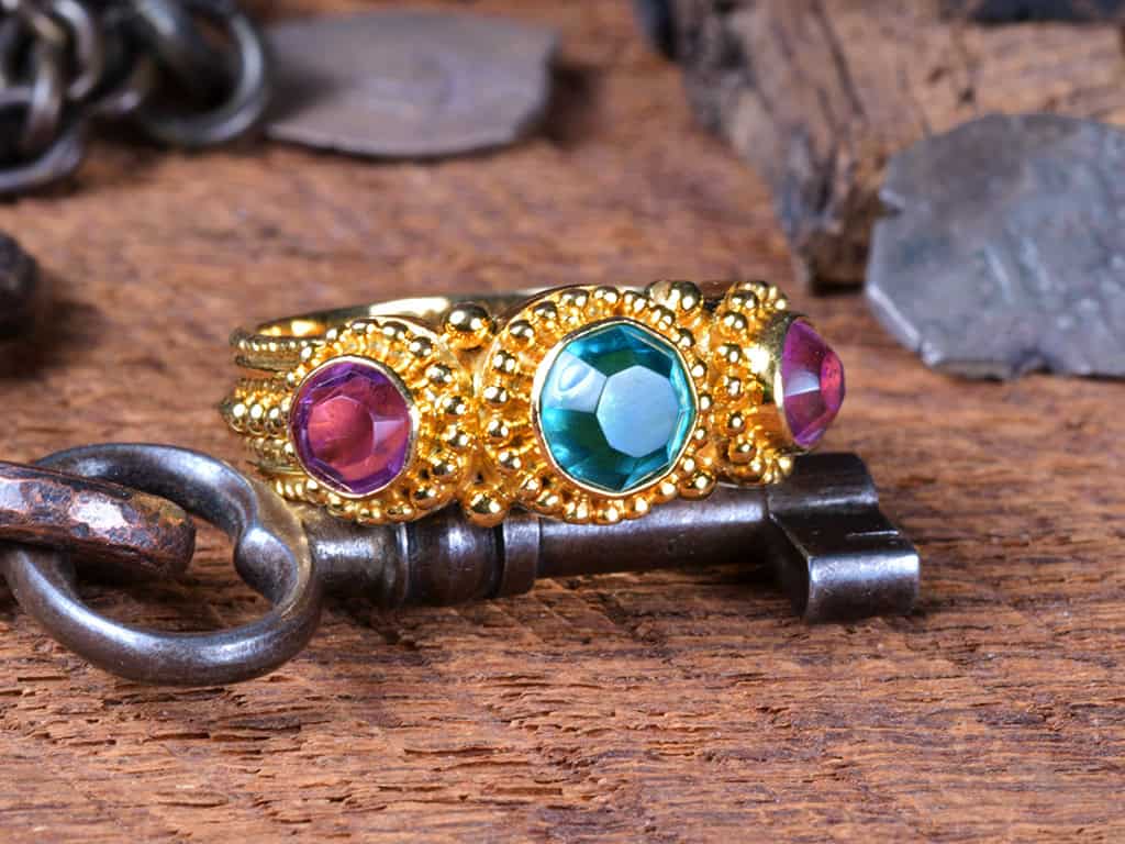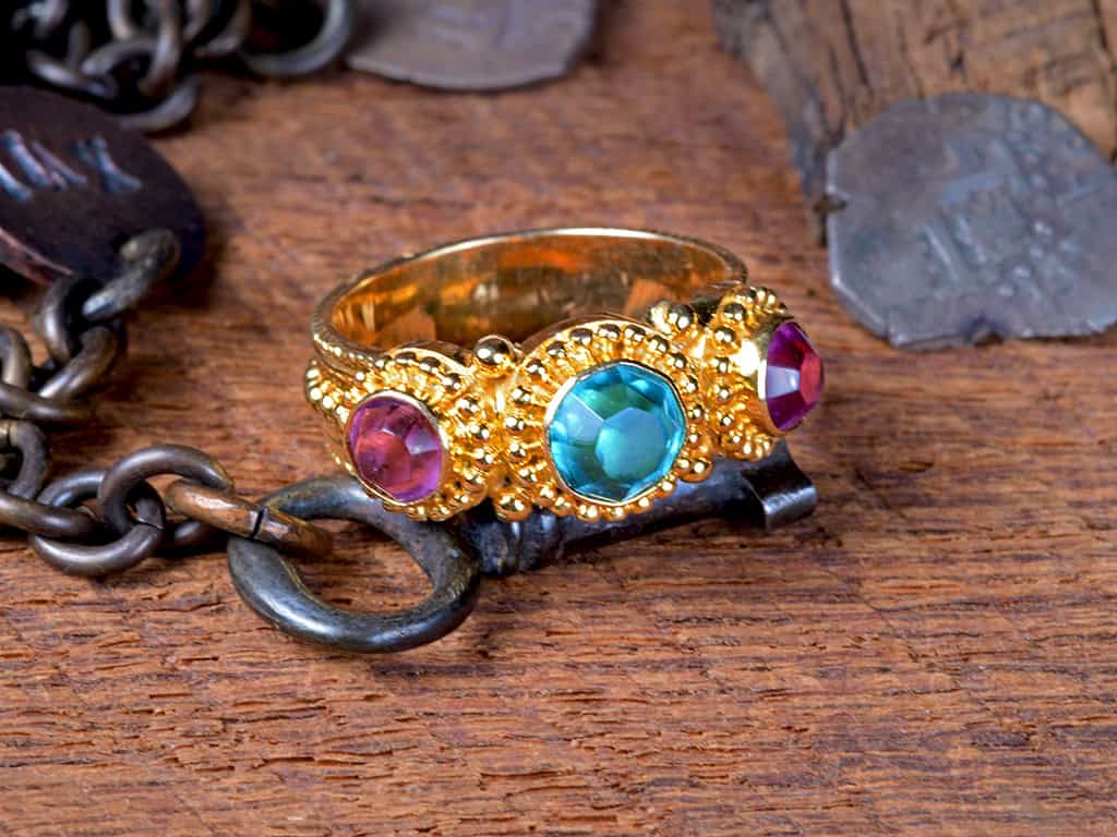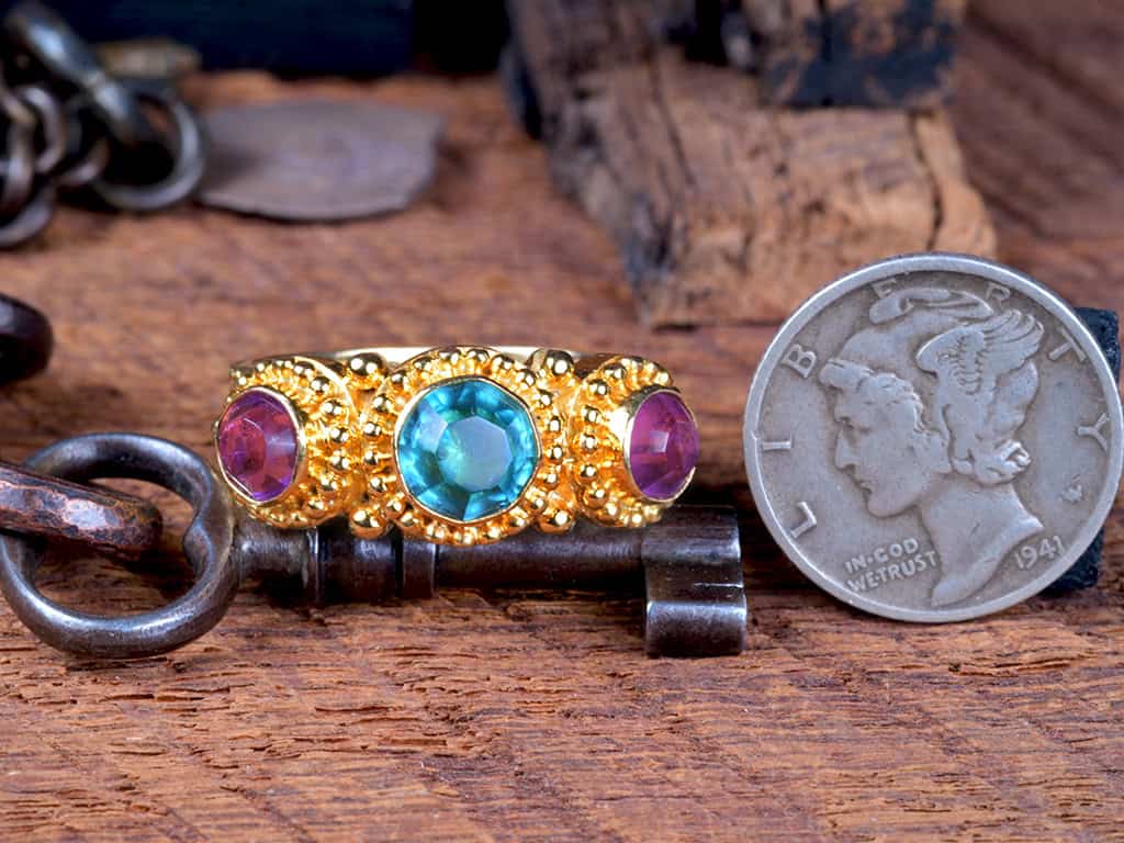 This is a gorgeous 3-stone 22k solid gold ring. The design is an interpretation of ancient Etruscan styles with highly detailed band.