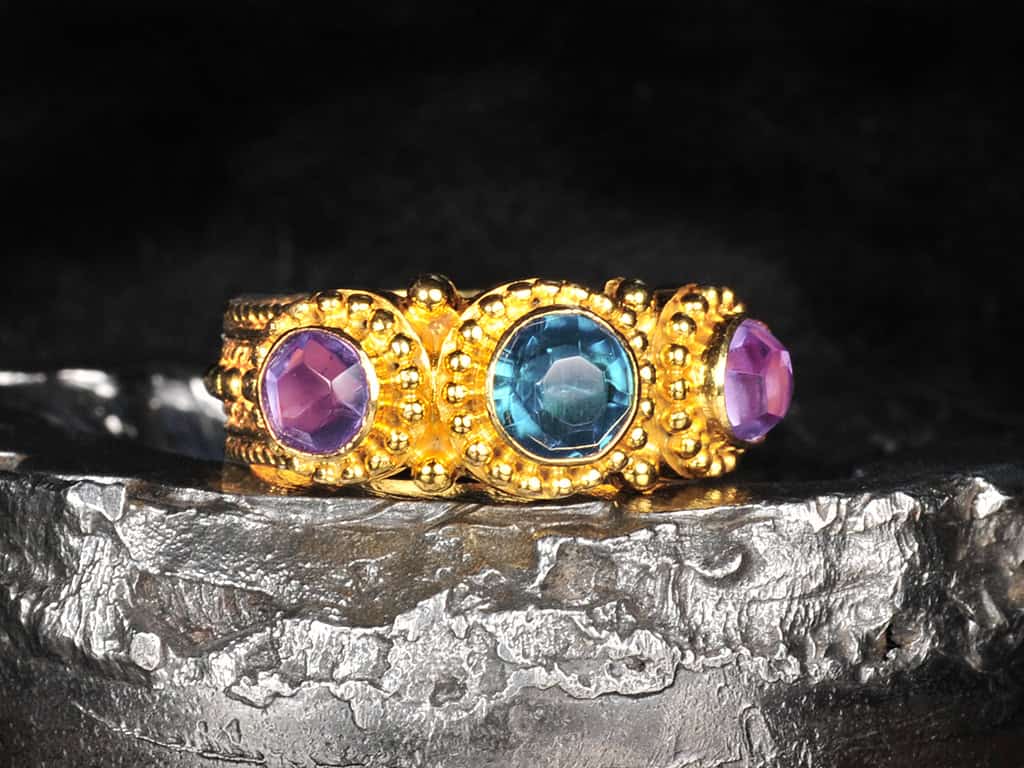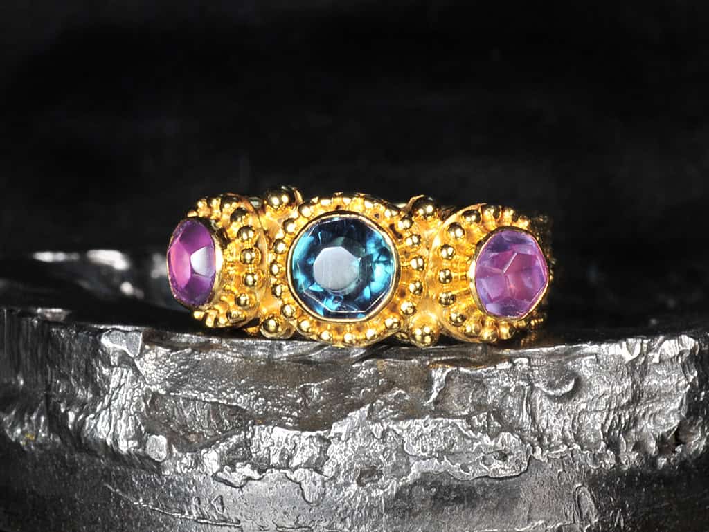 This is a gorgeous 3-stone 22k solid gold ring. The design is an interpretation of ancient Etruscan styles with highly detailed band.
