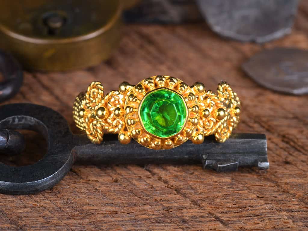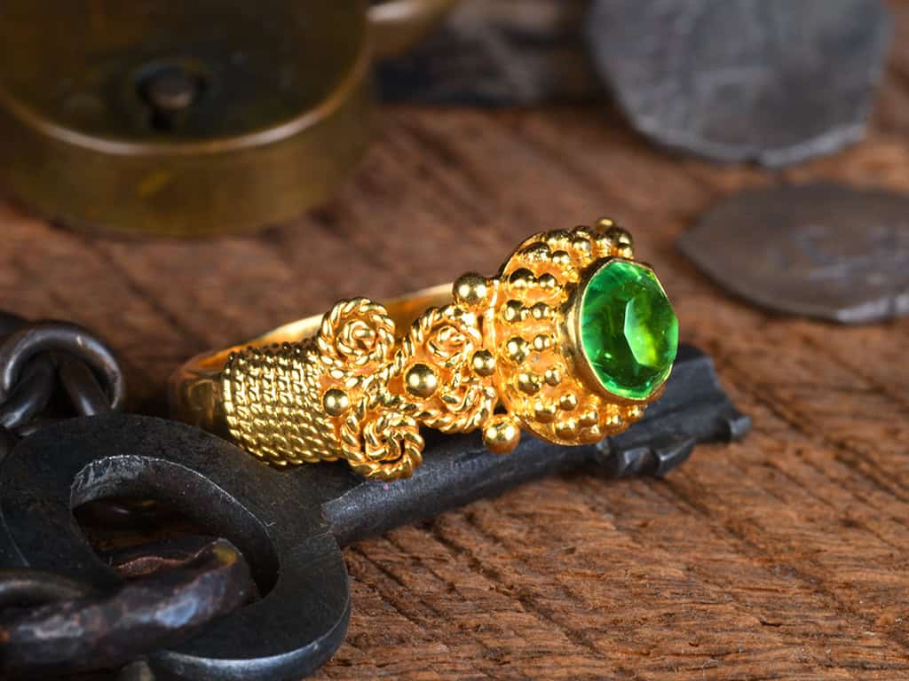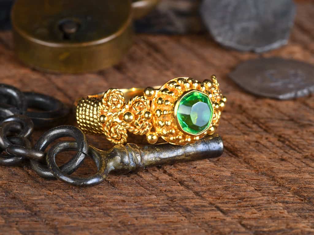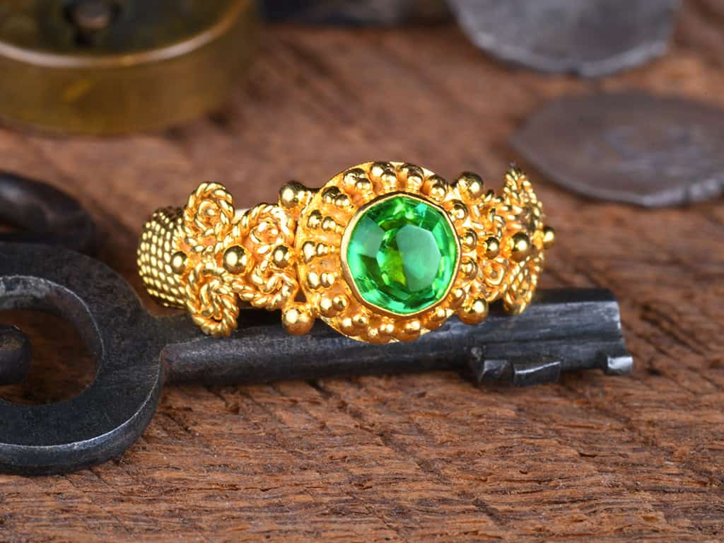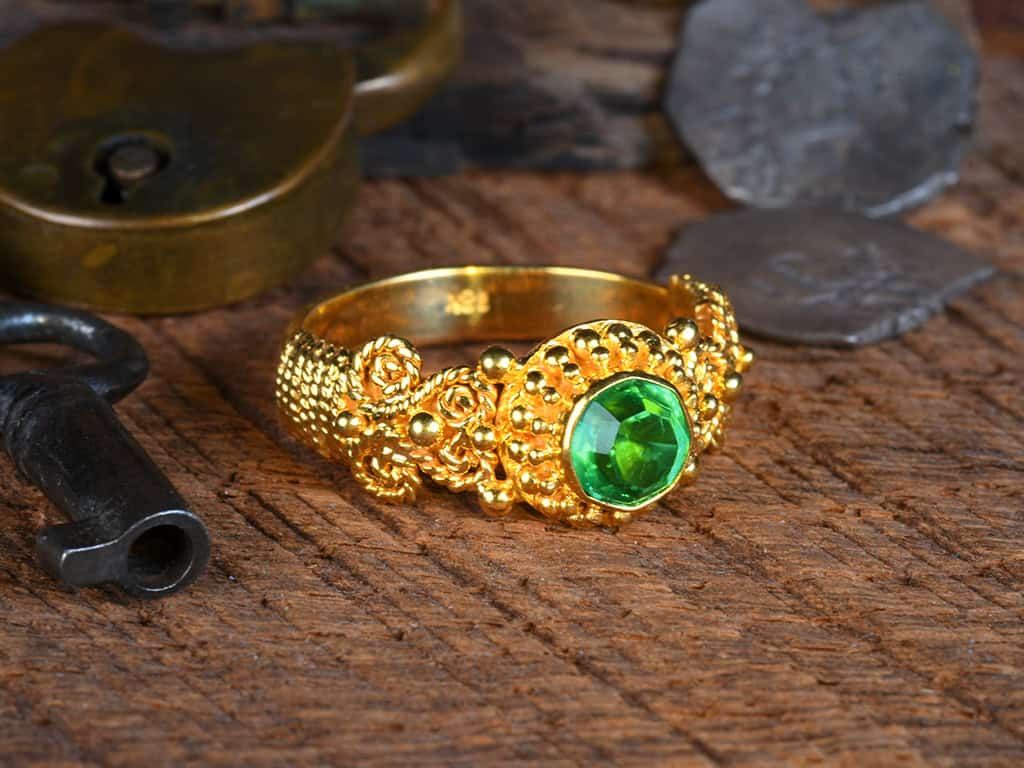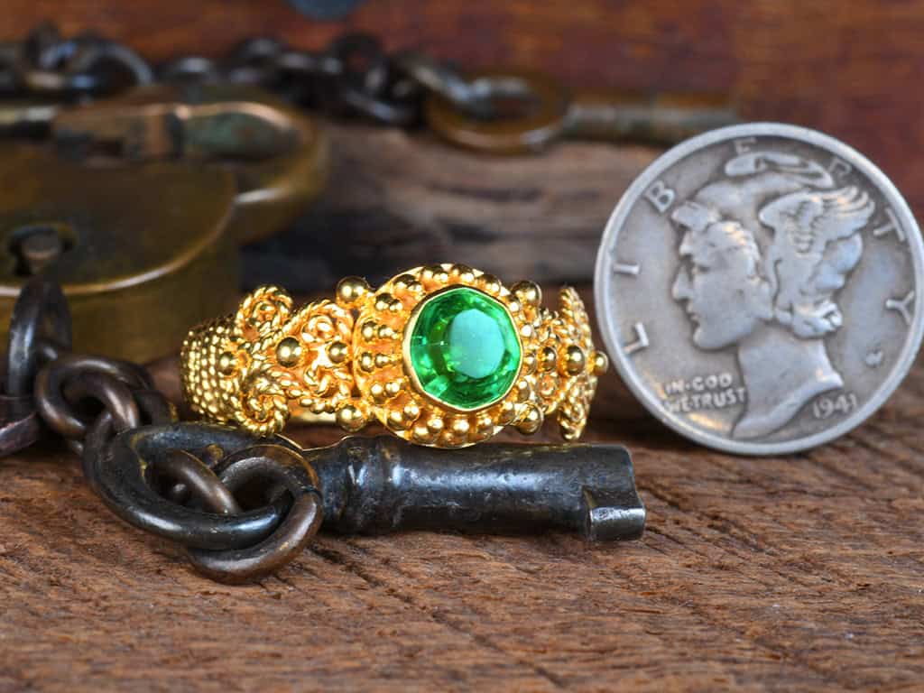This is an 18k solid gold ring with a beautiful chrome tourmaline. The design is based on an ancient Etruscan style with intricate twisted wire details. Chrome tourmaline is a rare form of tourmaline that is colored green by chromium. This piece has a beautiful medium-green hue that is bright and has almost no flaws or inclusions.