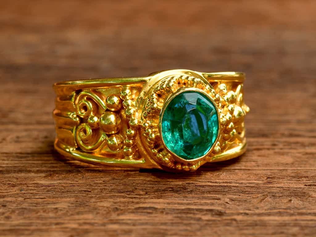 This is a gorgeous wide-band 18k solid gold ring. The piece is based on Balinese designs with a lot of intricate granulation around the bezel and precise wire decorative elements on the band. This is a really substantial piece with nearly 10.5 grams of 18k gold.