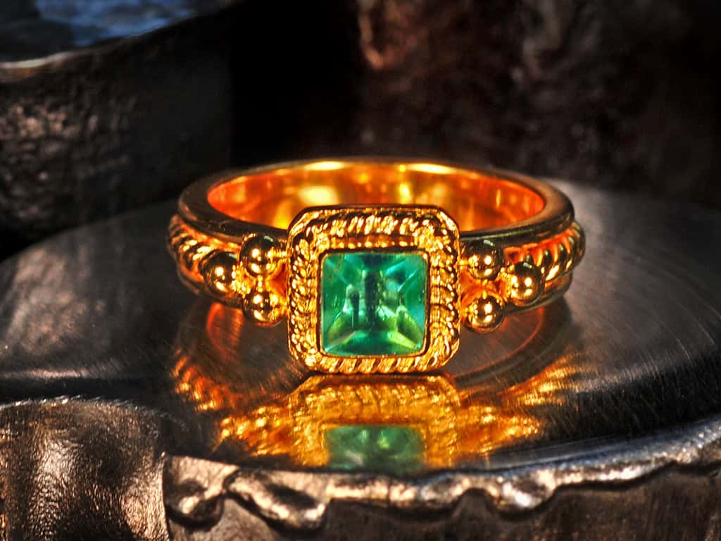 This is an 18k solid gold ring with a light-green emerald. The design is a simple one with twisted wire around the bezel and twisted wire around the band. The setting is accented with a few tiny gold balls.