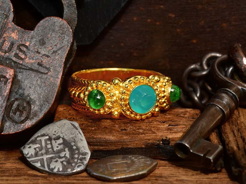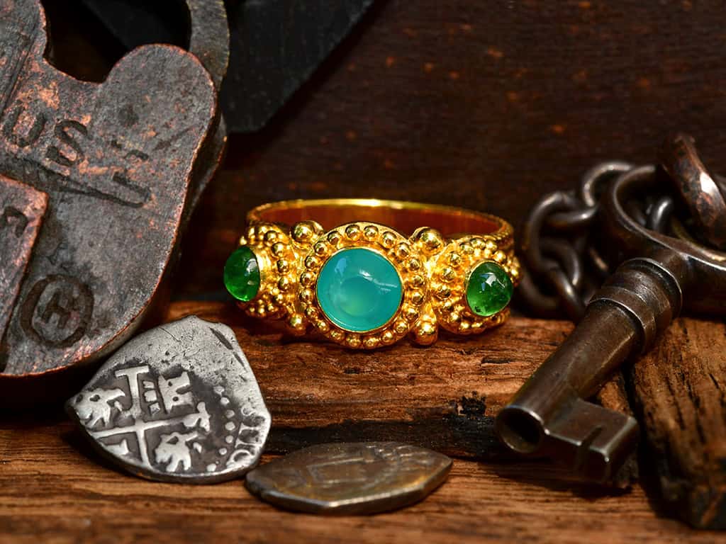 This is a 3-stone 18k solid gold ring. The design is an interpretation of ancient Etruscan styles with highly detailed band. The center stone is Caribbean blue gem silica from a mine in Mexico that has closed long ago. I find pieces of this material from time to time in collections and incorporate it into pieces like this that are truly one of a kind. The side stones are forest green Tsavorite.
