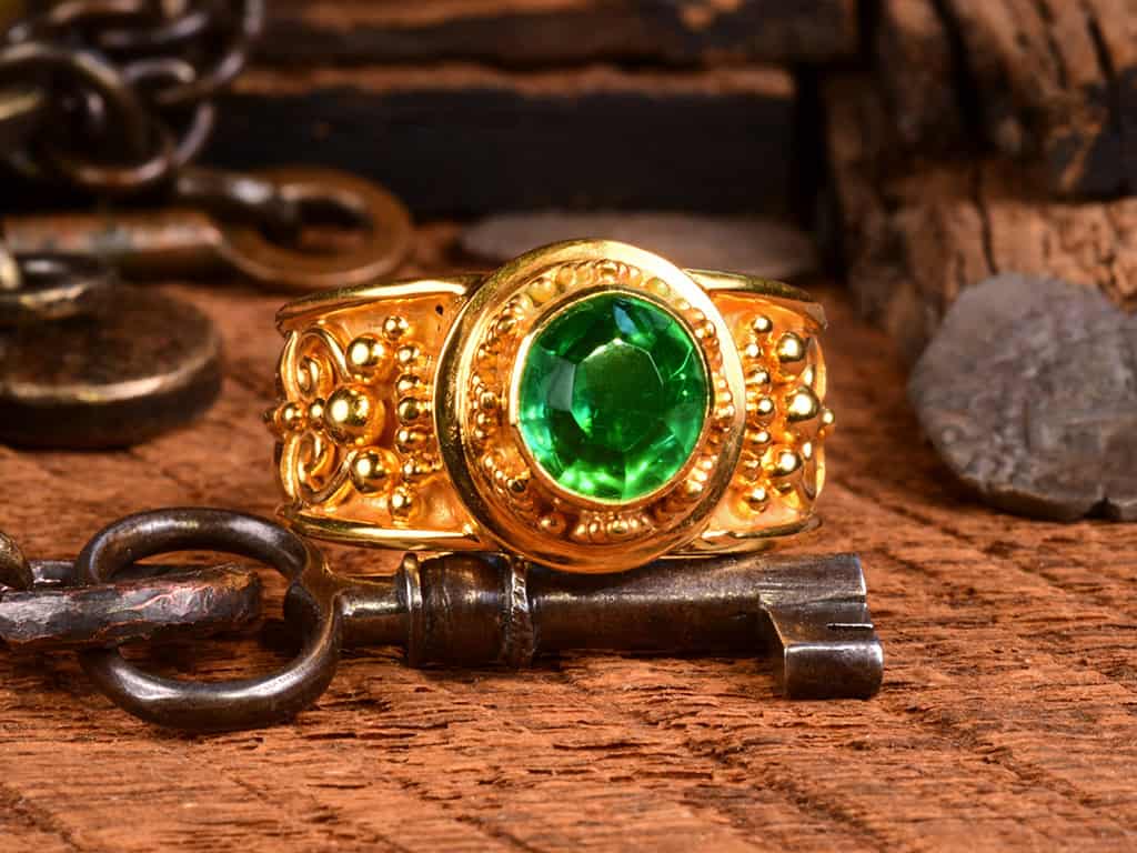 This is an 18k solid gold ring with a beautiful medium-green tourmaline. The design is classic Balinese with fine granulation around the bezel as well as fancy details on either side of the setting. This is a really substantial piece with over 12.5 grams of 18k gold.