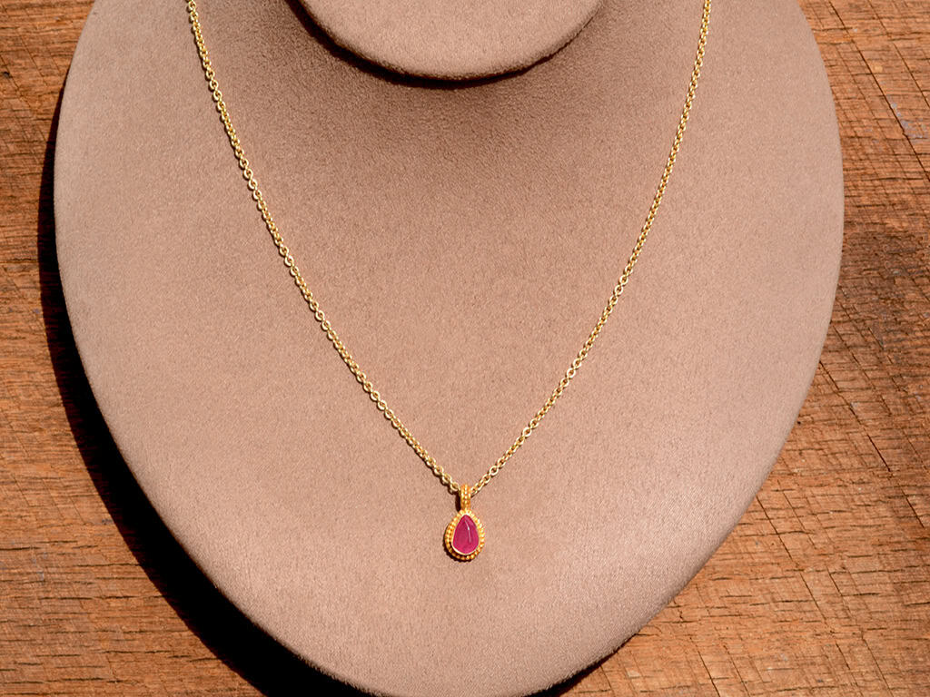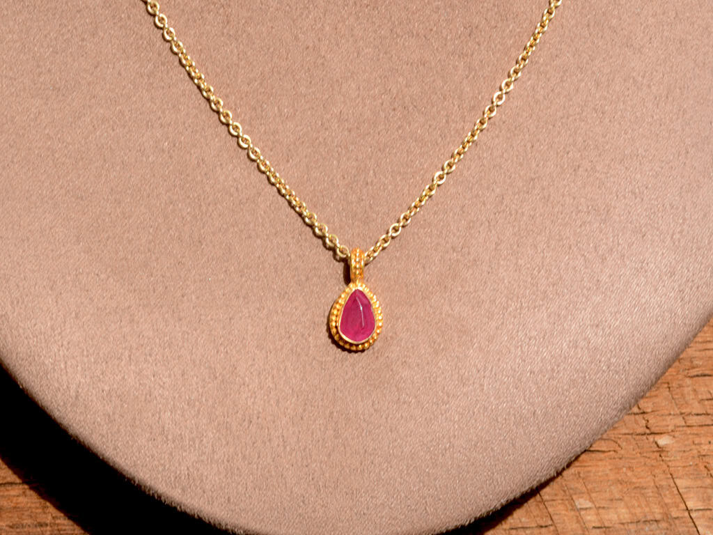 This is a really nice pink sapphire and 18k solid gold pendant. Sapphire is the same material as ruby (corundum) but is usually only called ruby when it is a deep dark red. This stone is probably dark enough to be considered a ruby but I have listed it as a pink sapphire because it is slightly less red than the rubies I have used in my work. I have photographed it both indoors in my studio as well as outside under sunlight (first photo) to give you a sense of what it will look like under different lighting.
