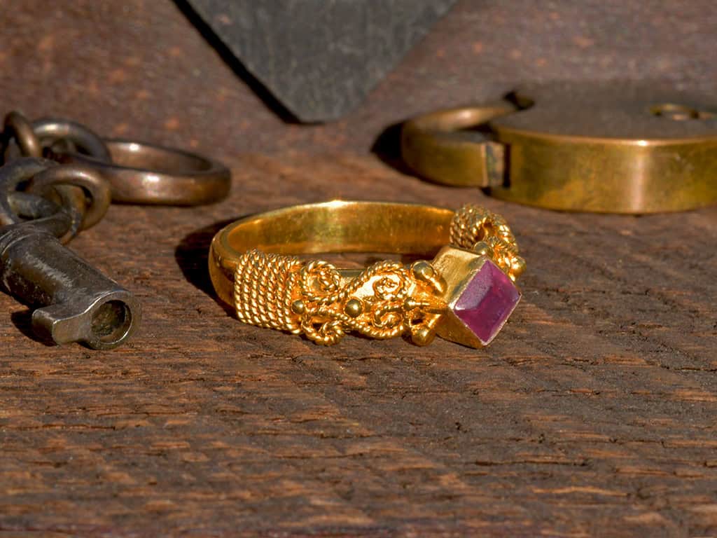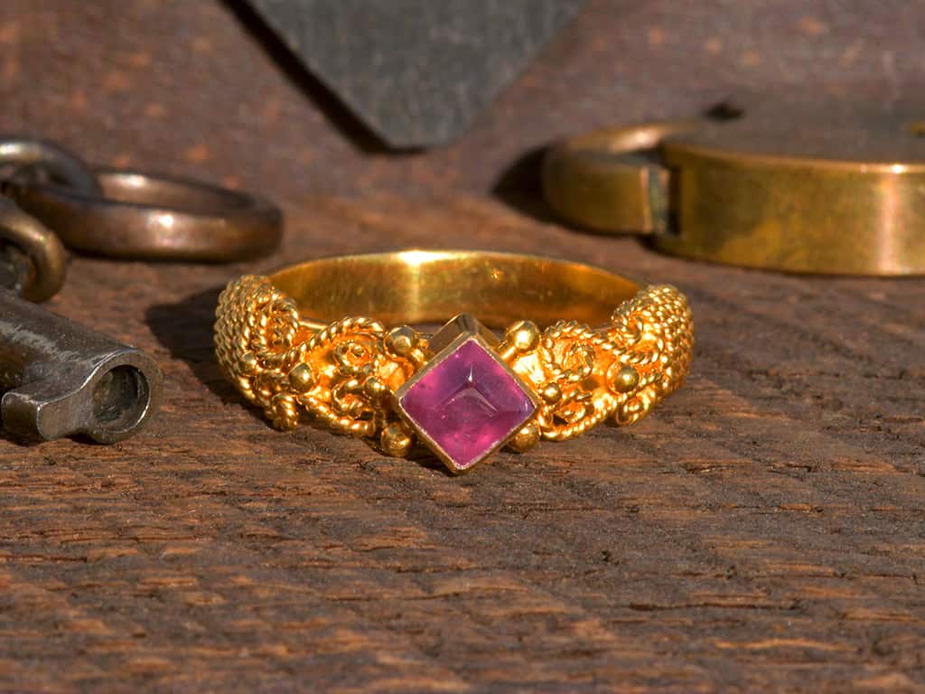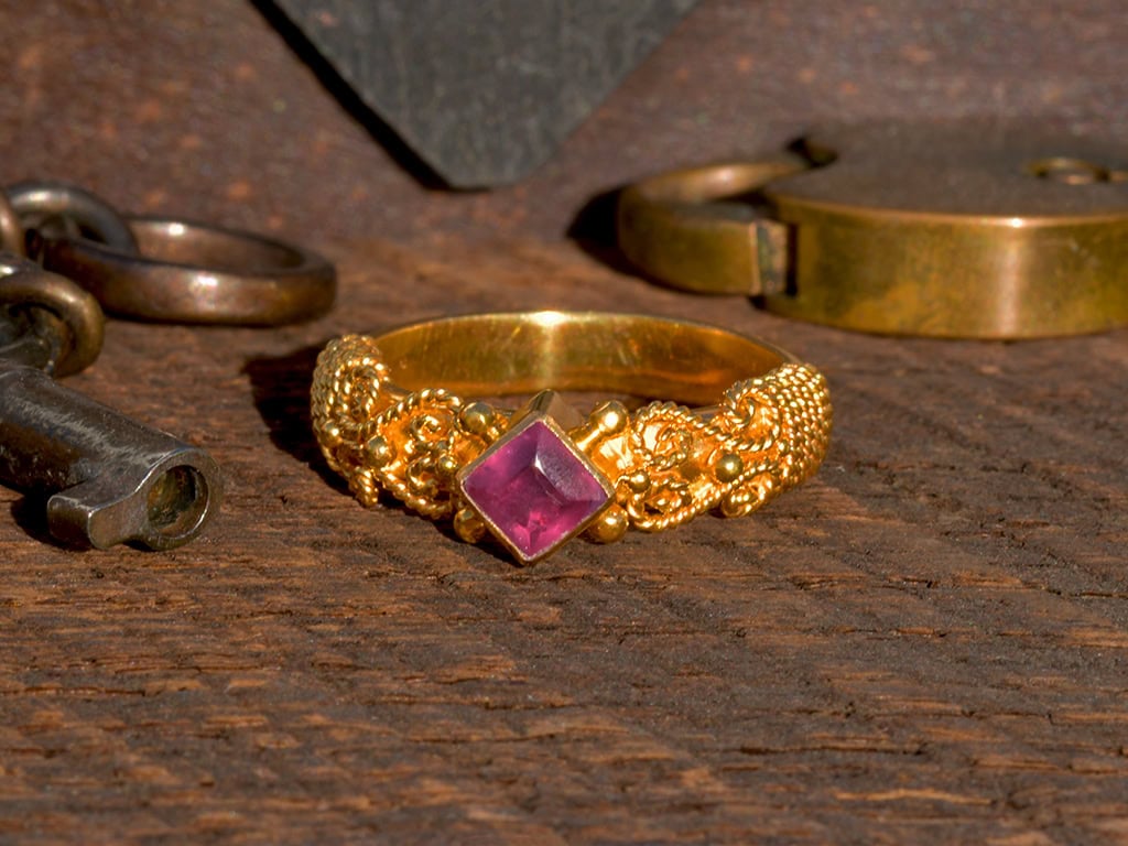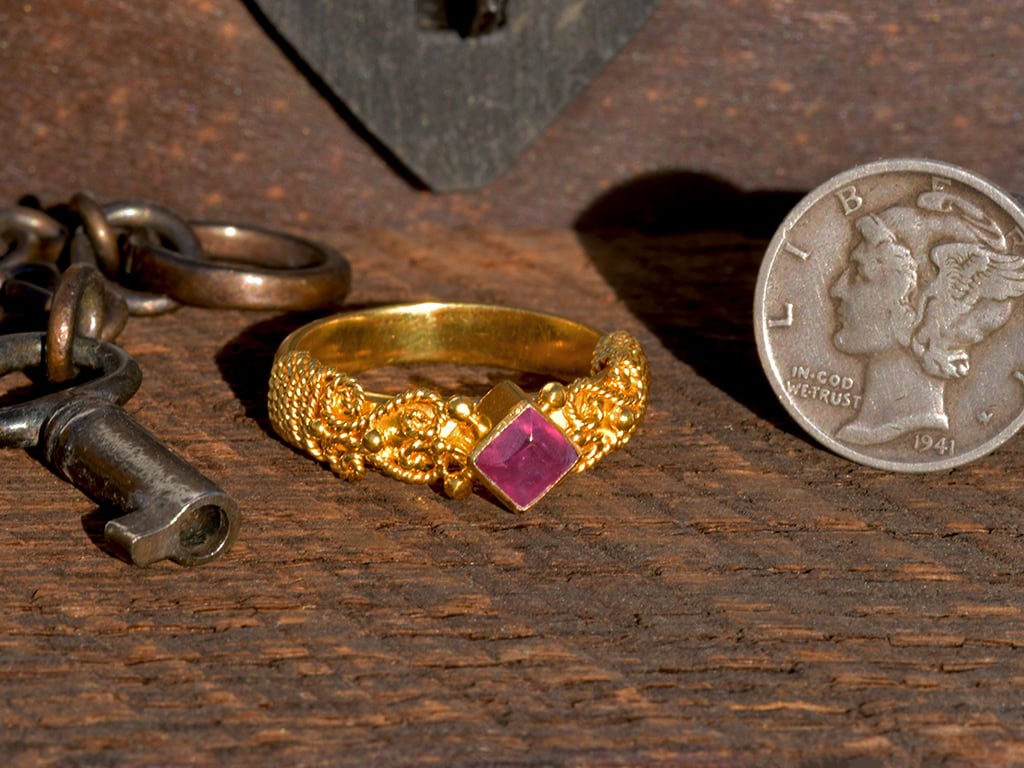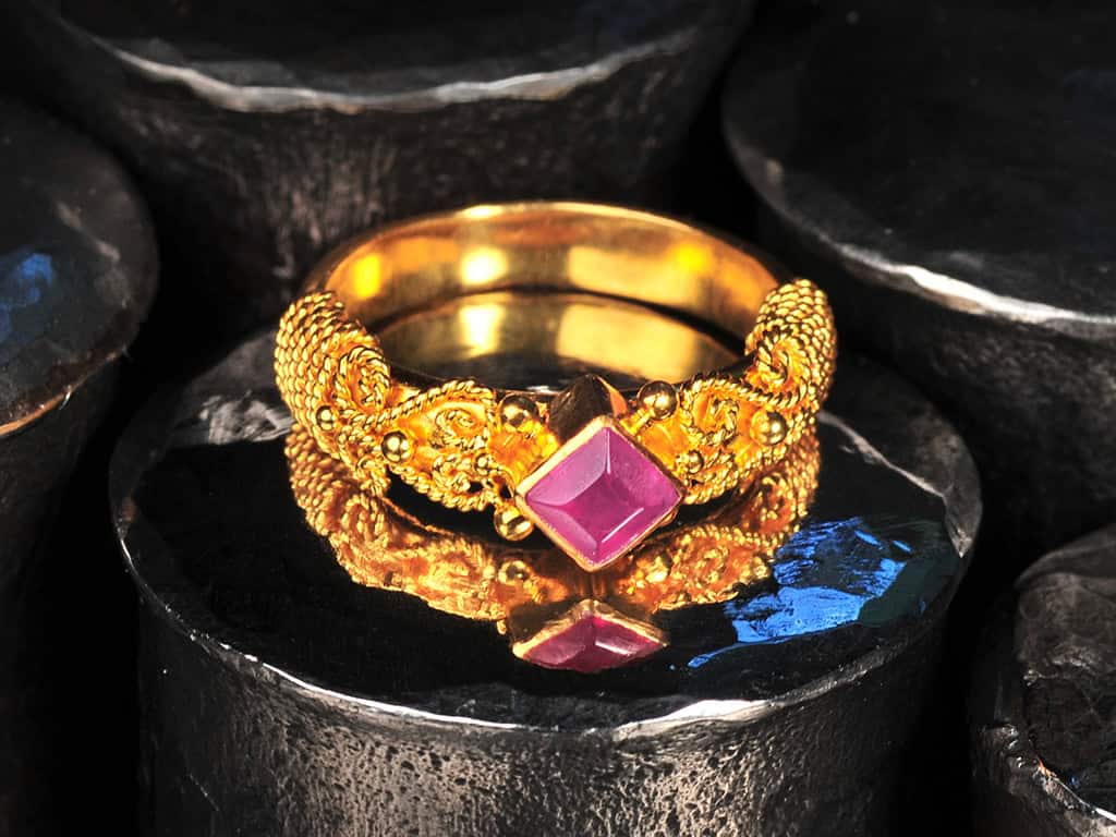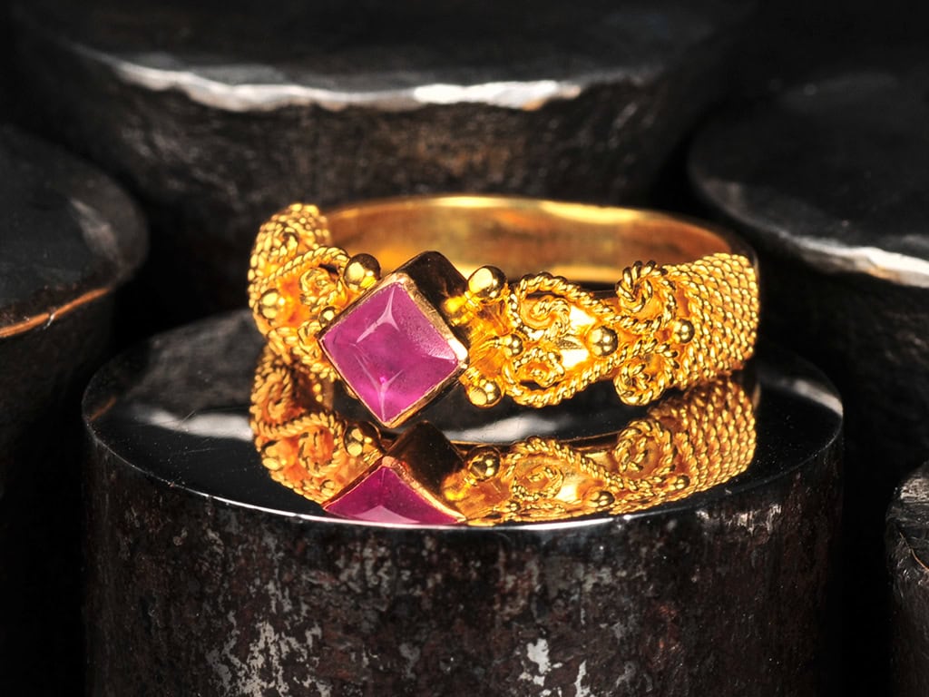 This is a 22k solid gold ring with a beautiful pink sapphire. The design is based on an ancient Etruscan style with intricate twisted wire details.