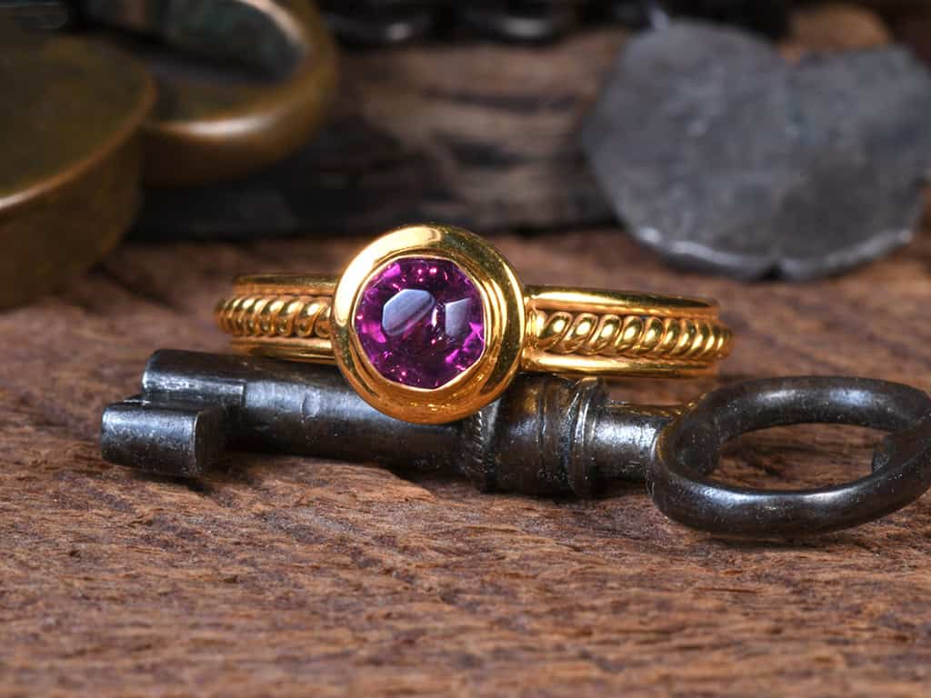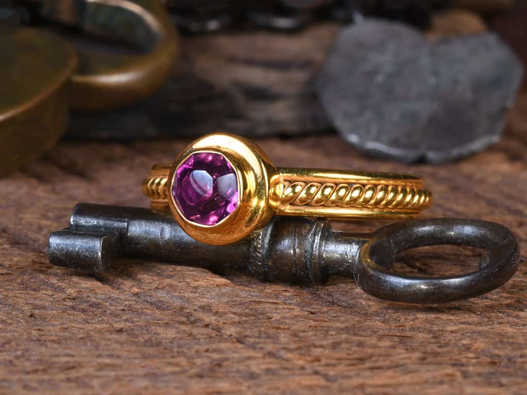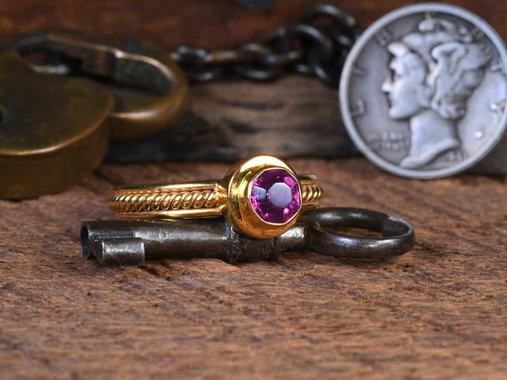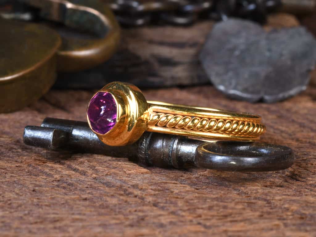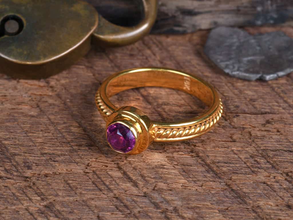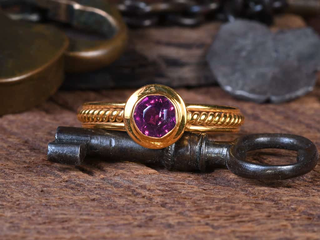This is a beautiful 18k solid gold ring with a bright purple garnet. The design is simple but pretty with a single row of thin twisted wire around the circumference of the band.