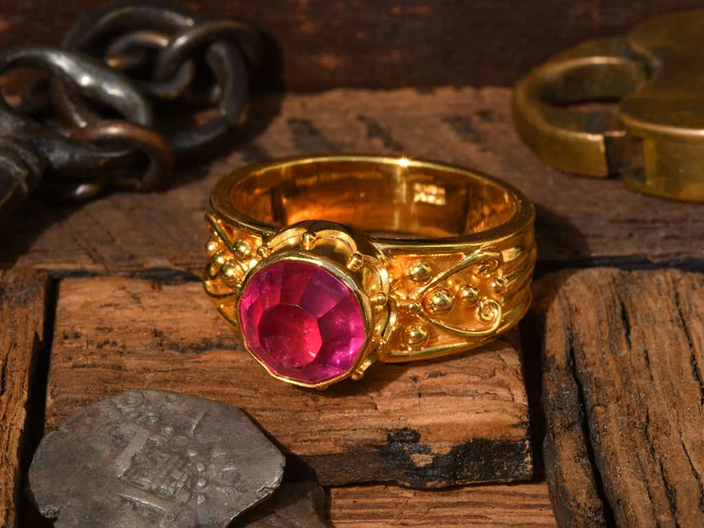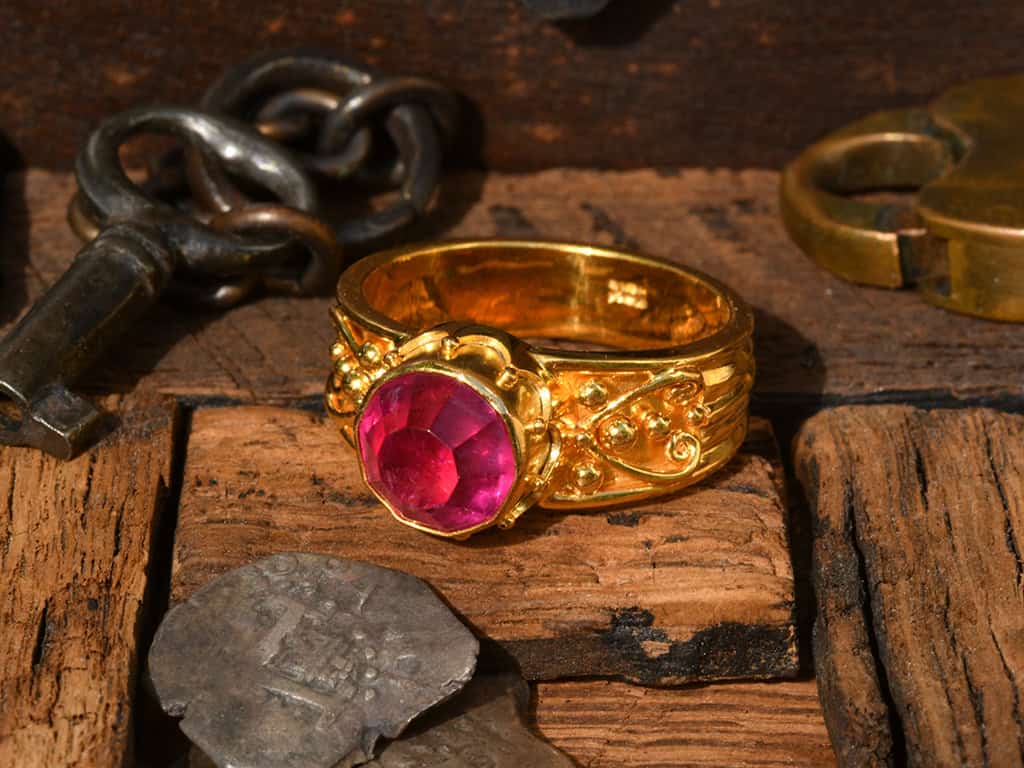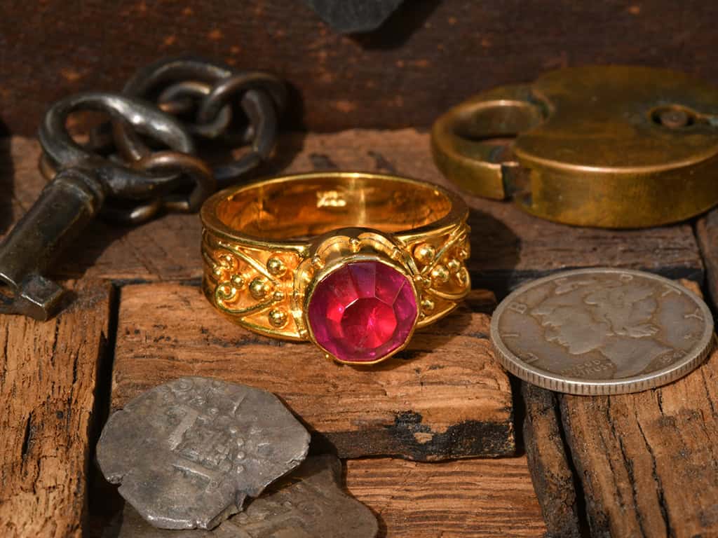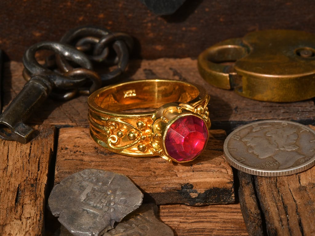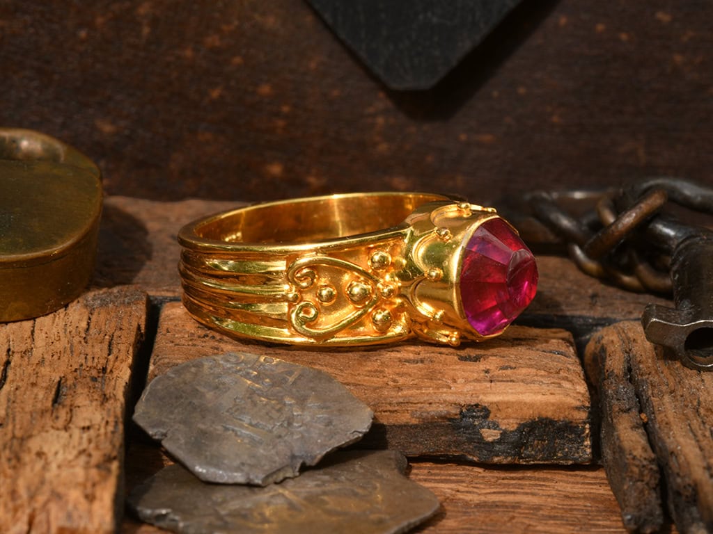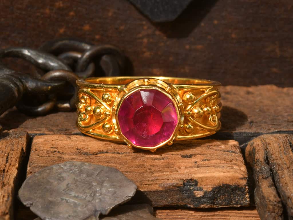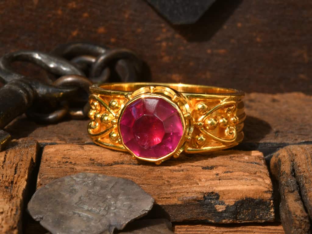 This is an incredible 18k solid gold ring set with a large red-pink tourmaline. The piece is based on Balinese designs with intricate decoration around the bezel and fine wire details on the band.