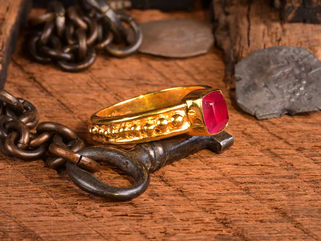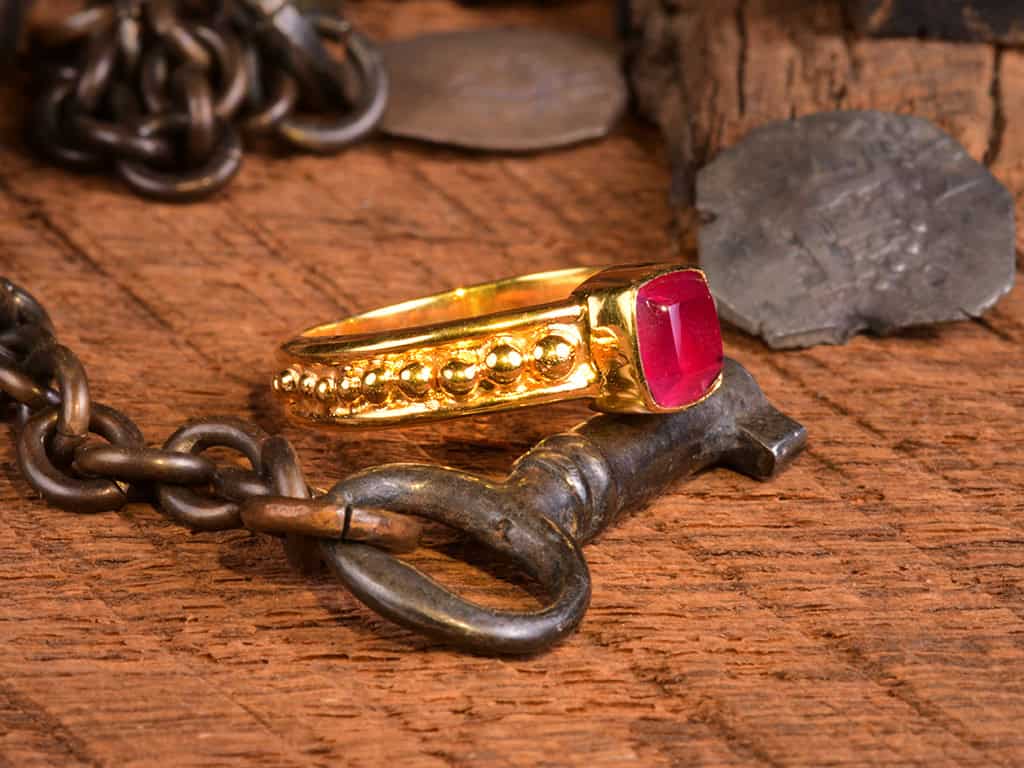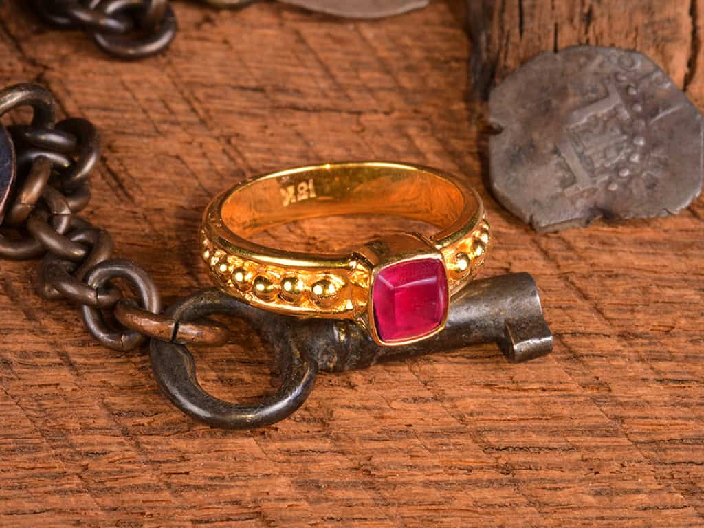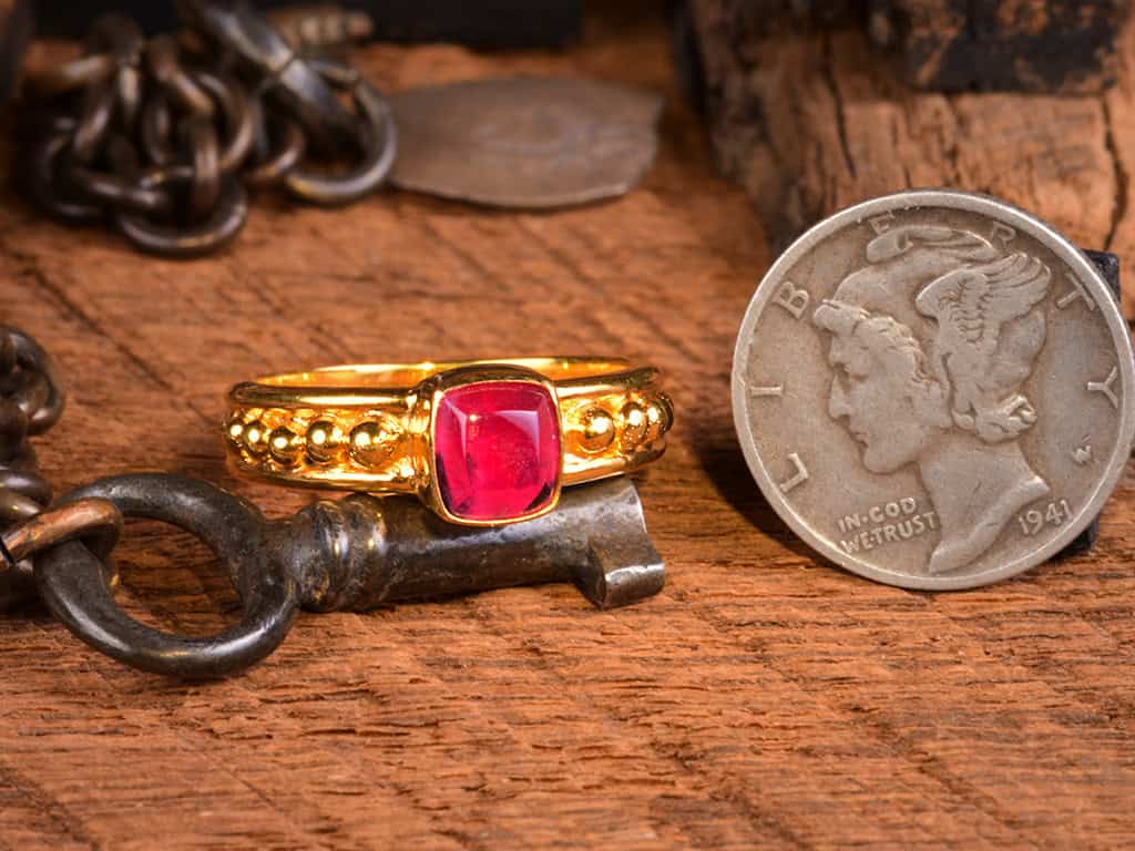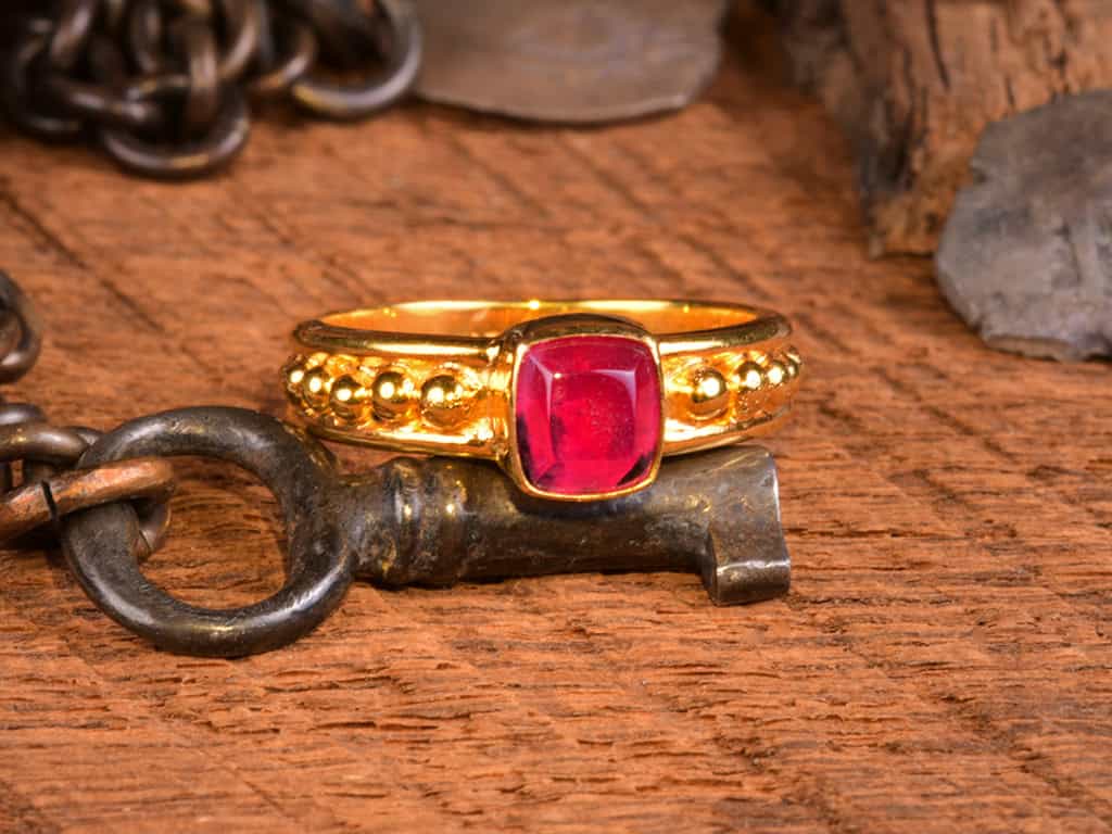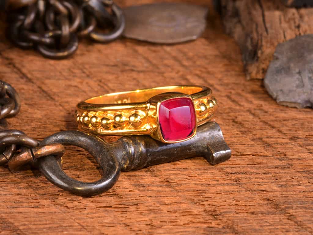 This is an 18k solid gold ring with a deep red natural ruby. The stone is set in a clean boxed setting and there is a graduated row of gold balls around band.