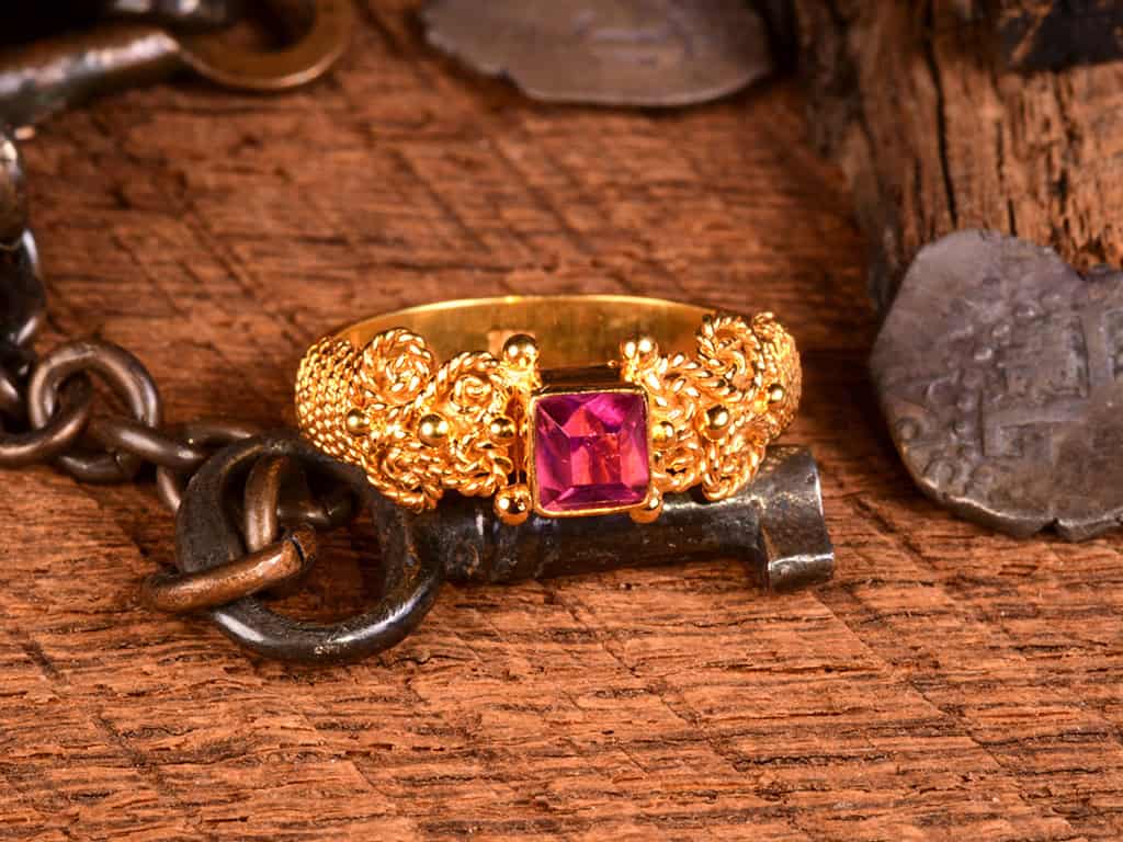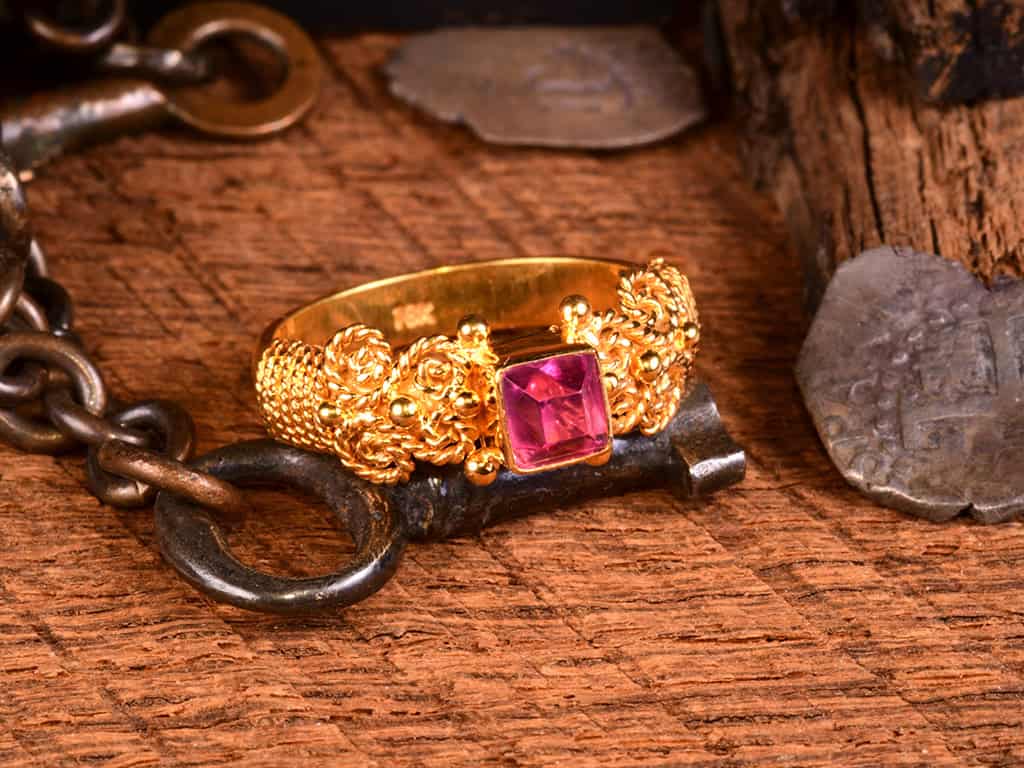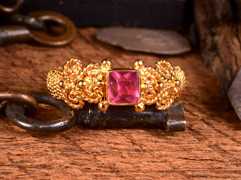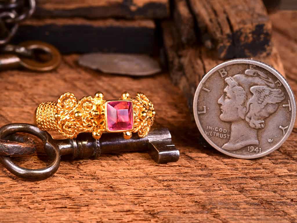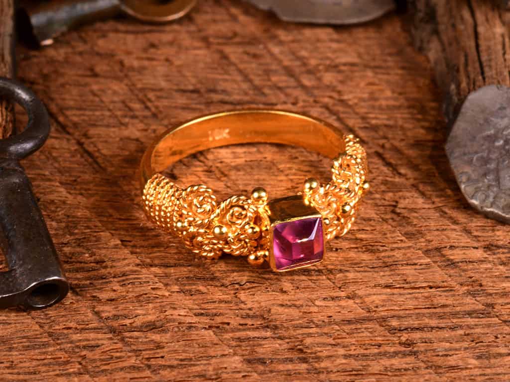 This is an 18k solid gold ring with a square-cut strawberry garnet. The design is based on an ancient Etruscan style with intricate twisted wire details.