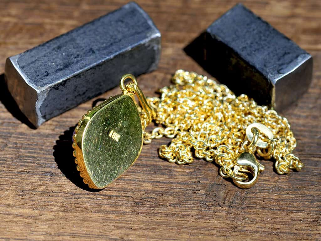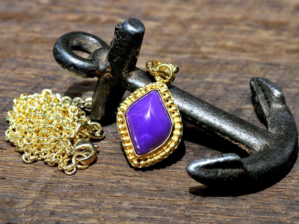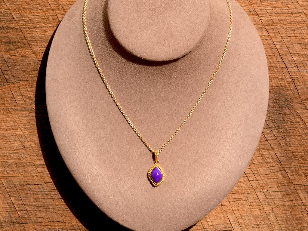 This is a beautiful sugilite and 18k solid gold pendant. The gemstone is top grade with classic bright purple color. It is cut into a high-dome “flame” cabochon giving the piece a rich look and feel.