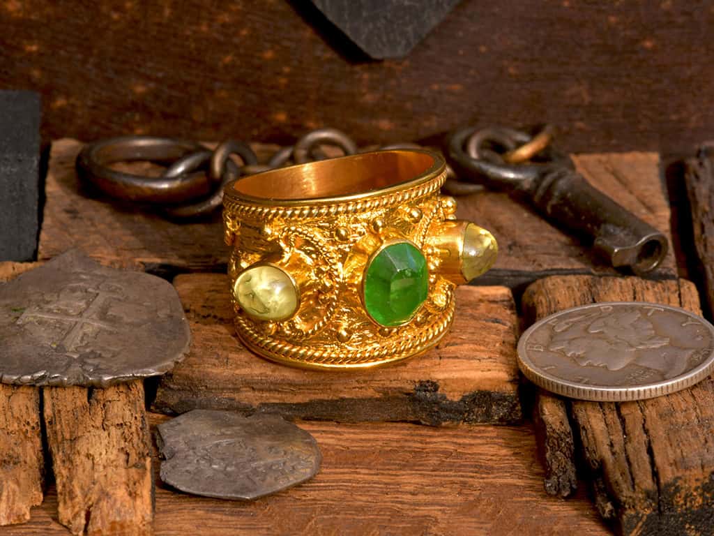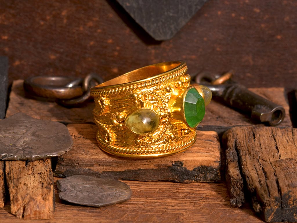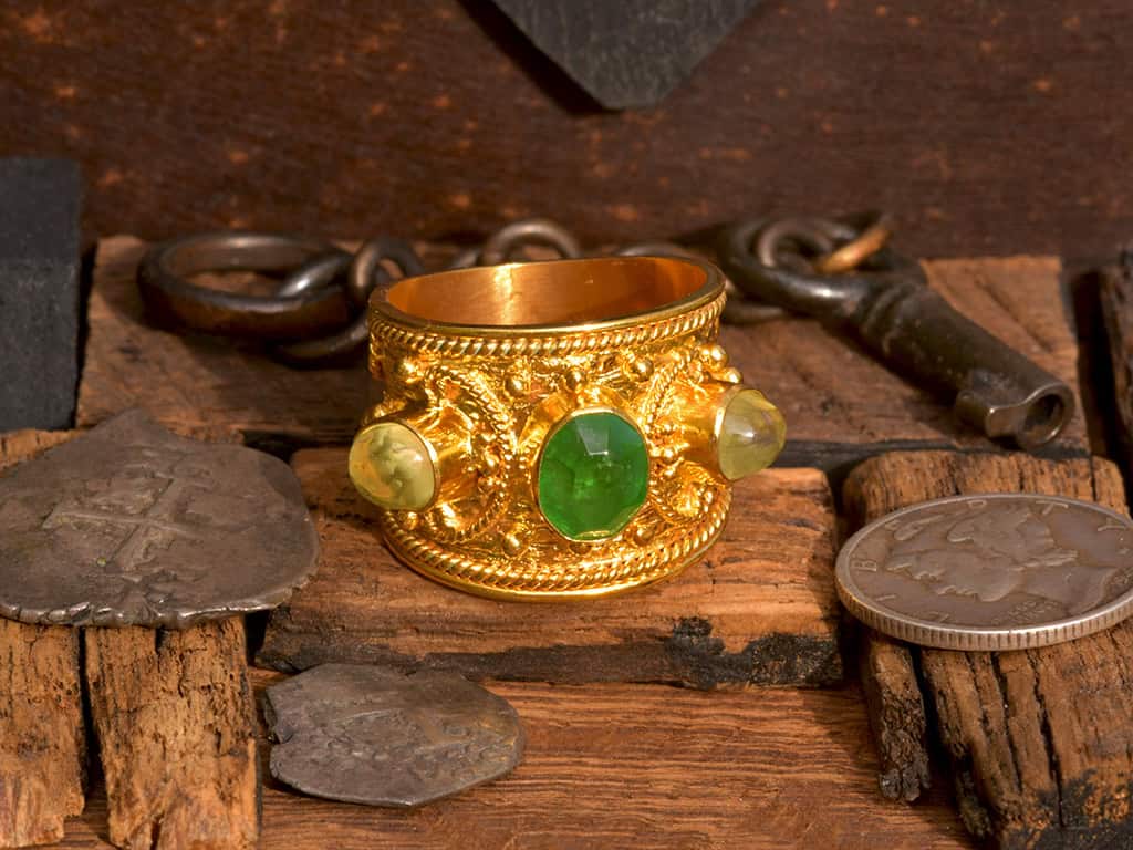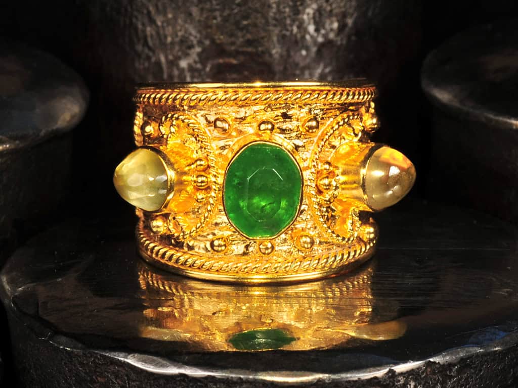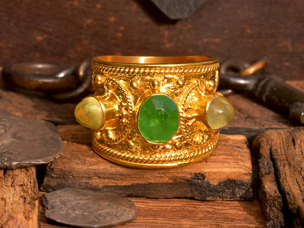 This is a beautiful 3-stone 18k solid gold ring. The design is based on ancient Etruscan ring designs. The Etruscans pre-dated the Romans in what is now southern Italy. I like this design because it has a lot of intricate granulation and twisted wire details. It is a medium-weight ring with just over 8 grams of 18k gold.