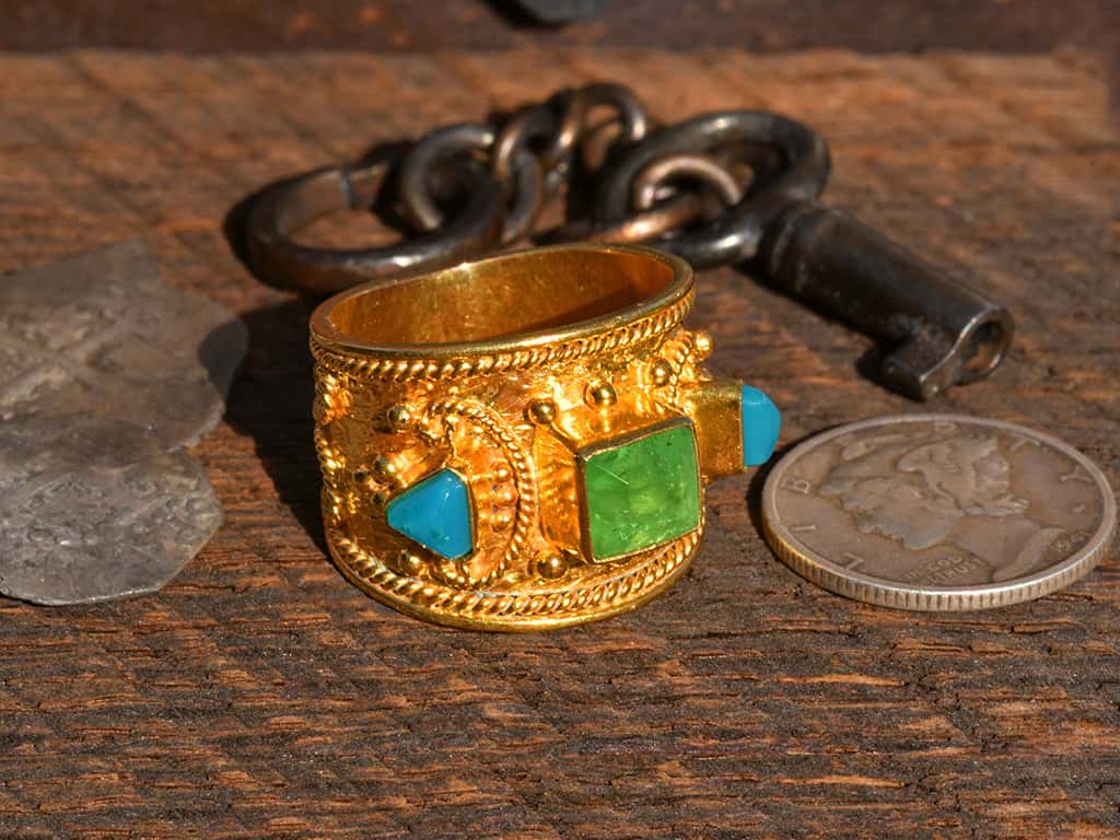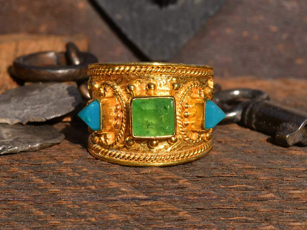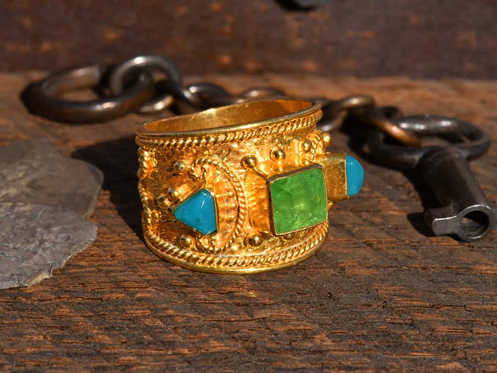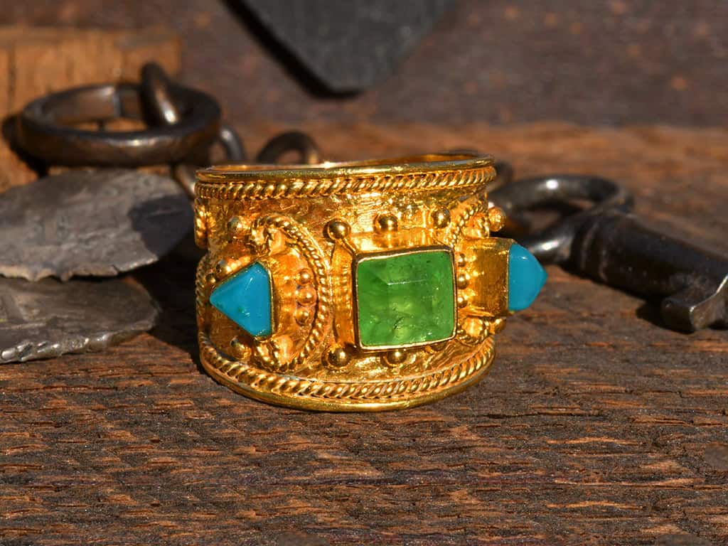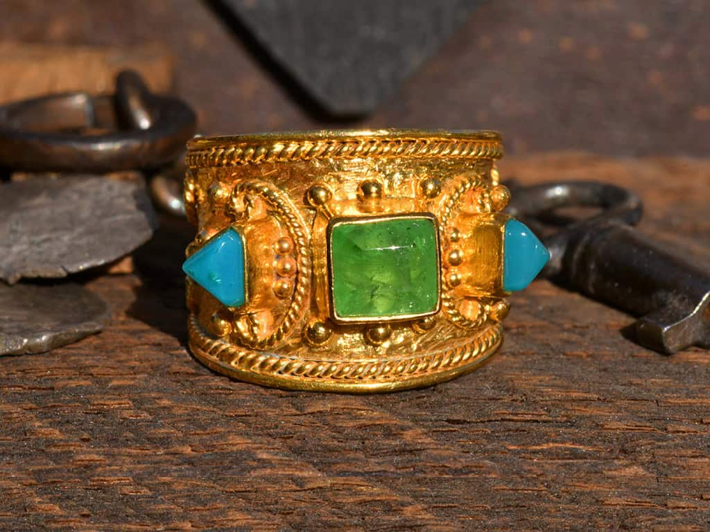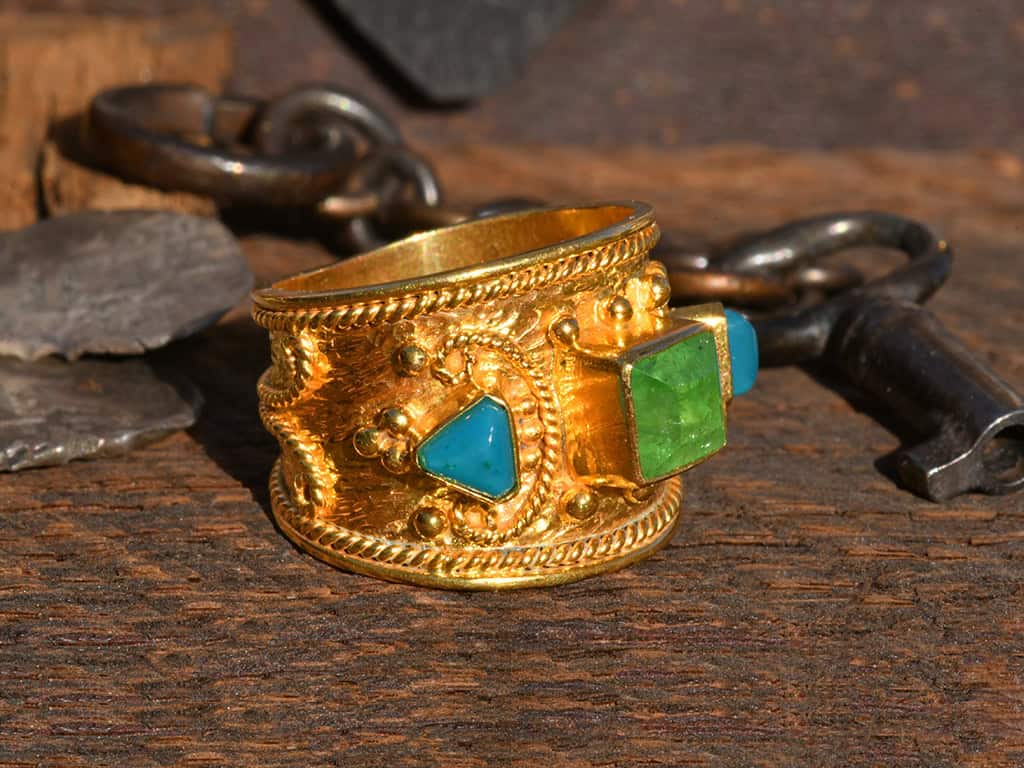 This is a beautiful 3-stone 18k solid gold ring. The design is based on ancient Etruscan ring designs. The Etruscans pre-dated the Romans in what is now southern Italy. I like this design because it has a lot of intricate granulation and twisted wire details.