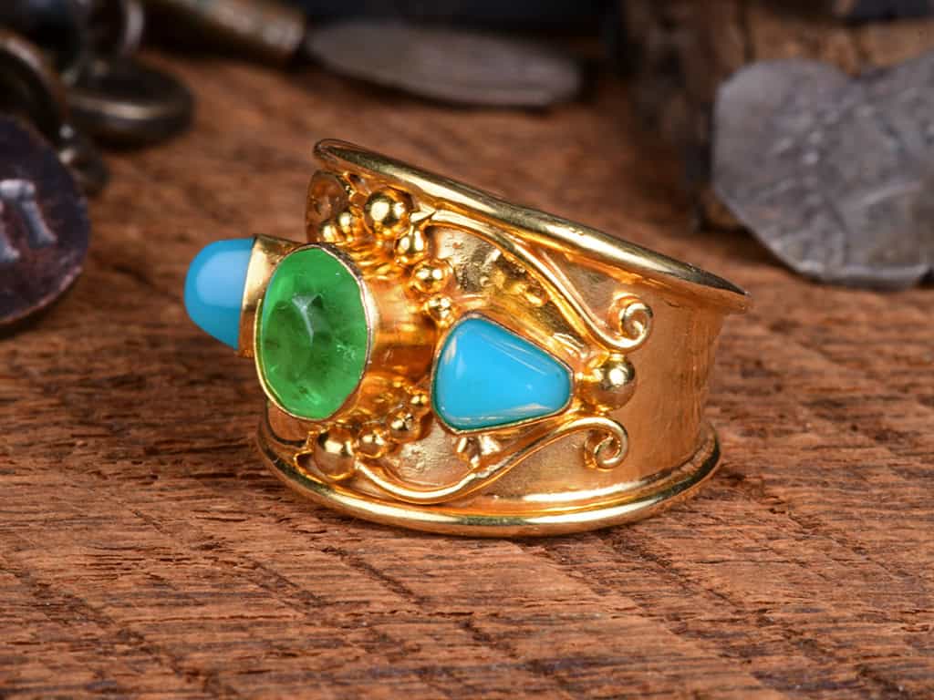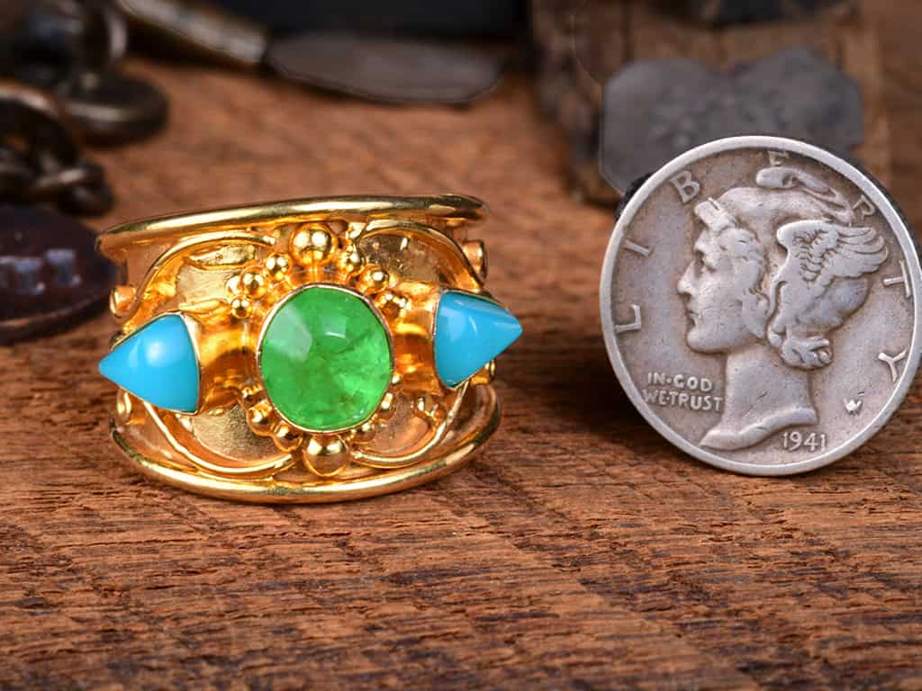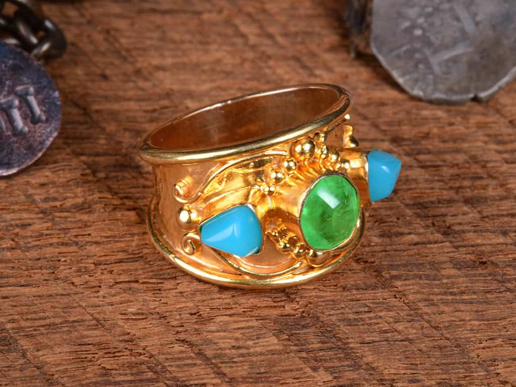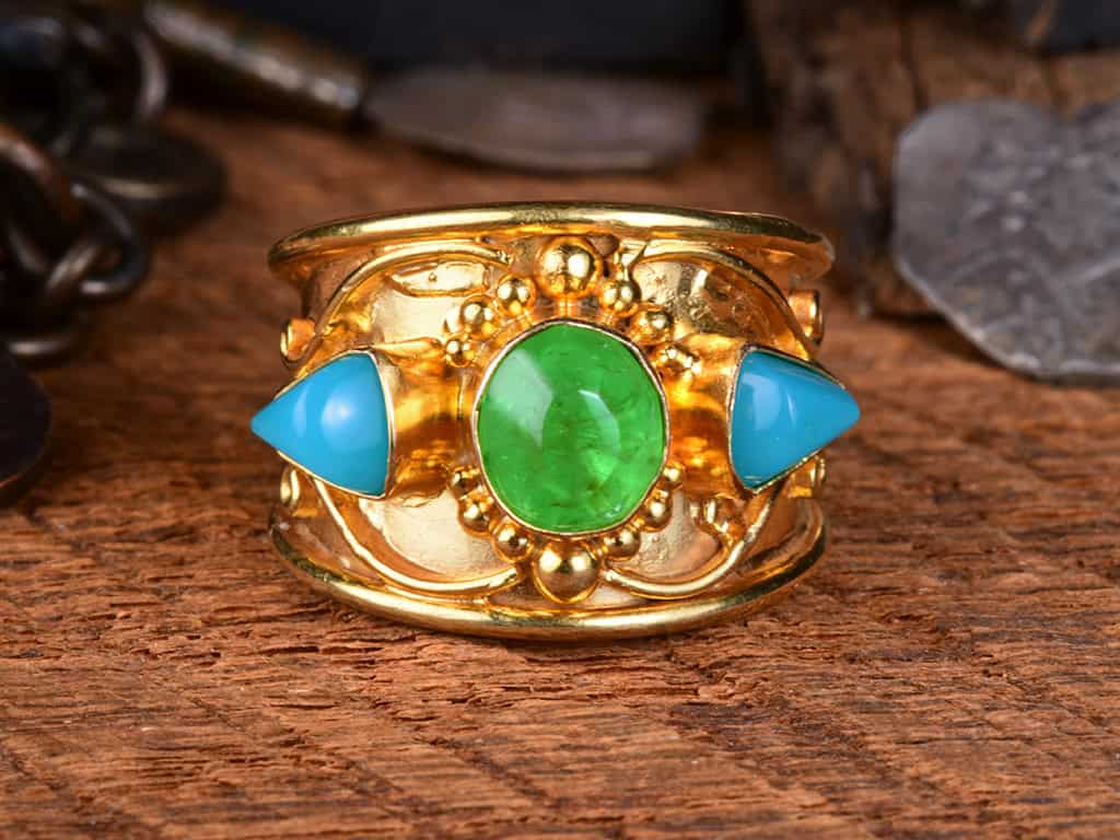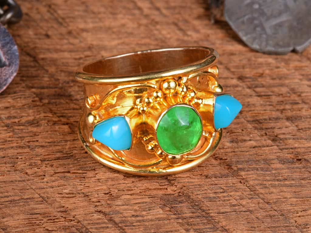 This is a gorgeous 3-stone 18k solid gold ring. The design is an interpretation of Balinese work with detailed granulation and ornamentation.